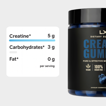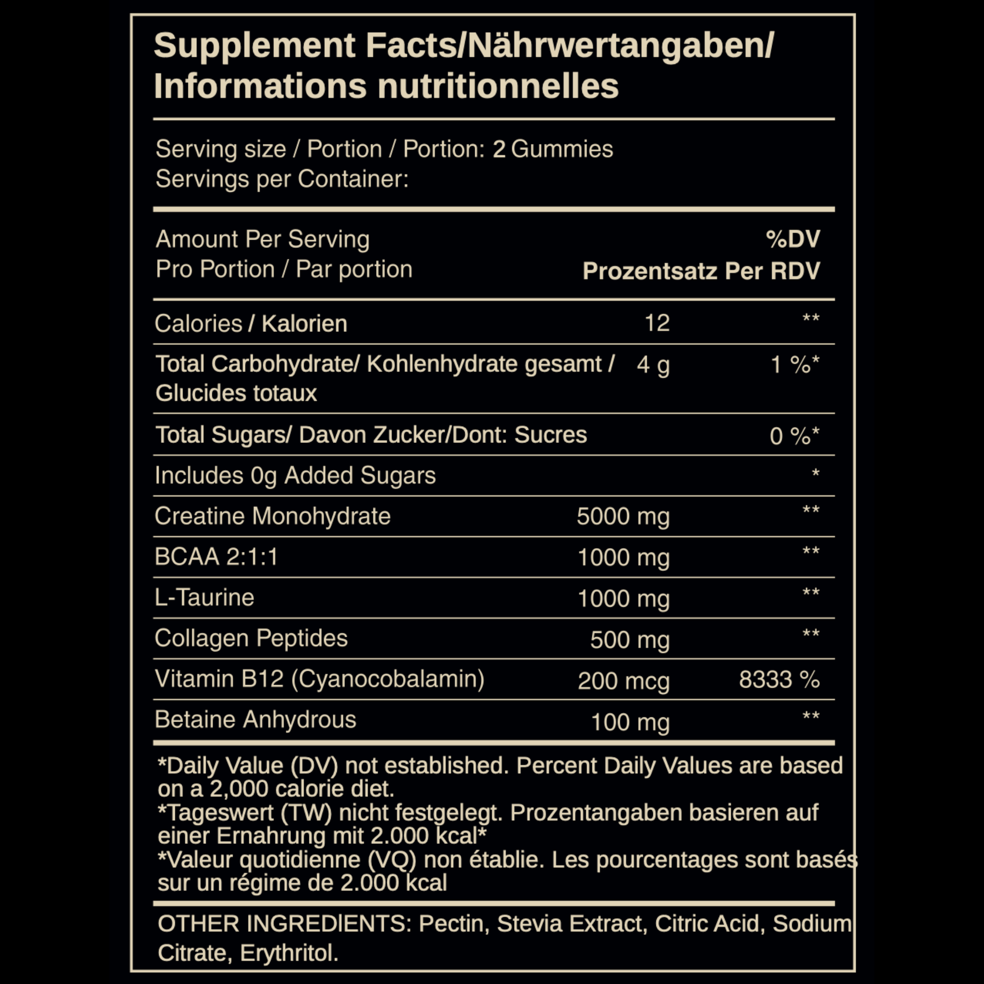 Pure, effective creatine in a simple gummy format. Each serving delivers 5 g of creatine — the gold standard for strength, performance, and recovery. Blueberry flavors make every serving taste like a treat. No mixing, no mess, just results. Key Benefits: • 5 g creatine per serving • Enhances strength, muscle mass, and explosive performance • Supports faster recovery between workouts • 100% vegan, sugar-free, and gluten-free-